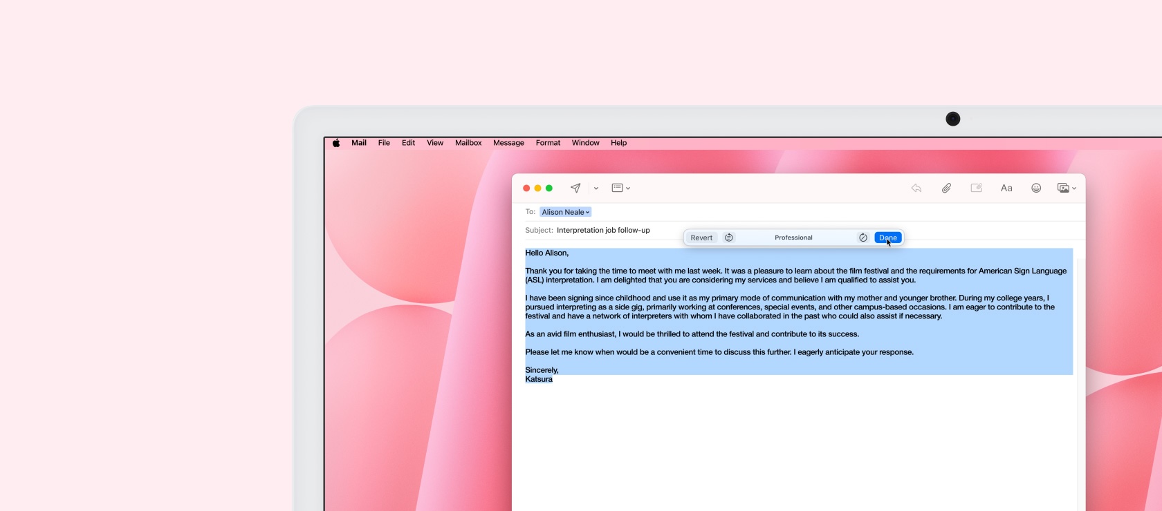 Writing Tools. Apple Intelligence can proofread your text and rewrite different versions until the tone and wording are just right, and summarize selected text with a click.