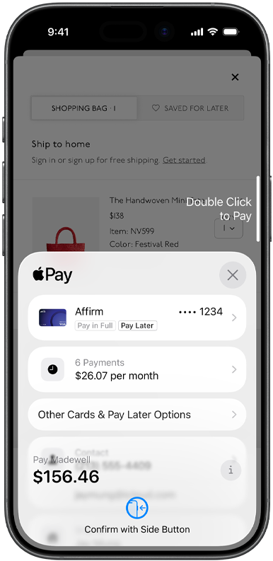 Apple Pay gives you flexibility at checkout when you shop in stores with iPhone, or online and in apps with iPhone or iPad. You can choose to pay in full or split your purchases into smaller payments over time through an eligible card or other pay later provider.2 You can also use your eligible credit or debit cards’ rewards, points, or miles to cover all or part of your purchase.3 When you redeem rewards, a statement credit is applied after the transaction is complete.