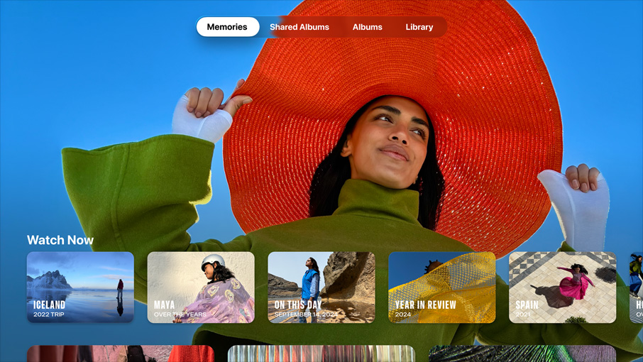 Photos. iCloud Shared Photo Library makes it easier than ever for the whole family to enjoy each other’s photos, and you can see them all right on your TV. And you can choose Memories as your screen saver and watch your special moments come alive on the big screen.