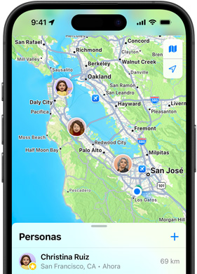 Encuentra fácilmente a amigos y familiares para mantenerse conectados y que los niños estén siempre protegidos. Puedes usar la pestaña Personas para invitar a tus amigos a compartir su ubicación o recibir alertas de ubicación automáticas, por ejemplo, cuando tu hijo sale del colegio. Los padres incluso pueden controlar la manera en que sus hijos comparten la ubicación.