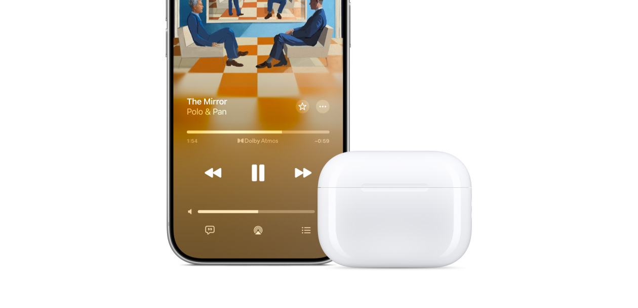 L’Égalisation adaptative ajuste la musique à vos oreilles en temps réel suivant la position de vos AirPods. Les micros orientés vers l’intérieur mesurent ce que vous entendez, puis règlent les basses, moyennes et hautes fréquences d’un morceau pour vous offrir un rendu détaillé, à chaque écoute.