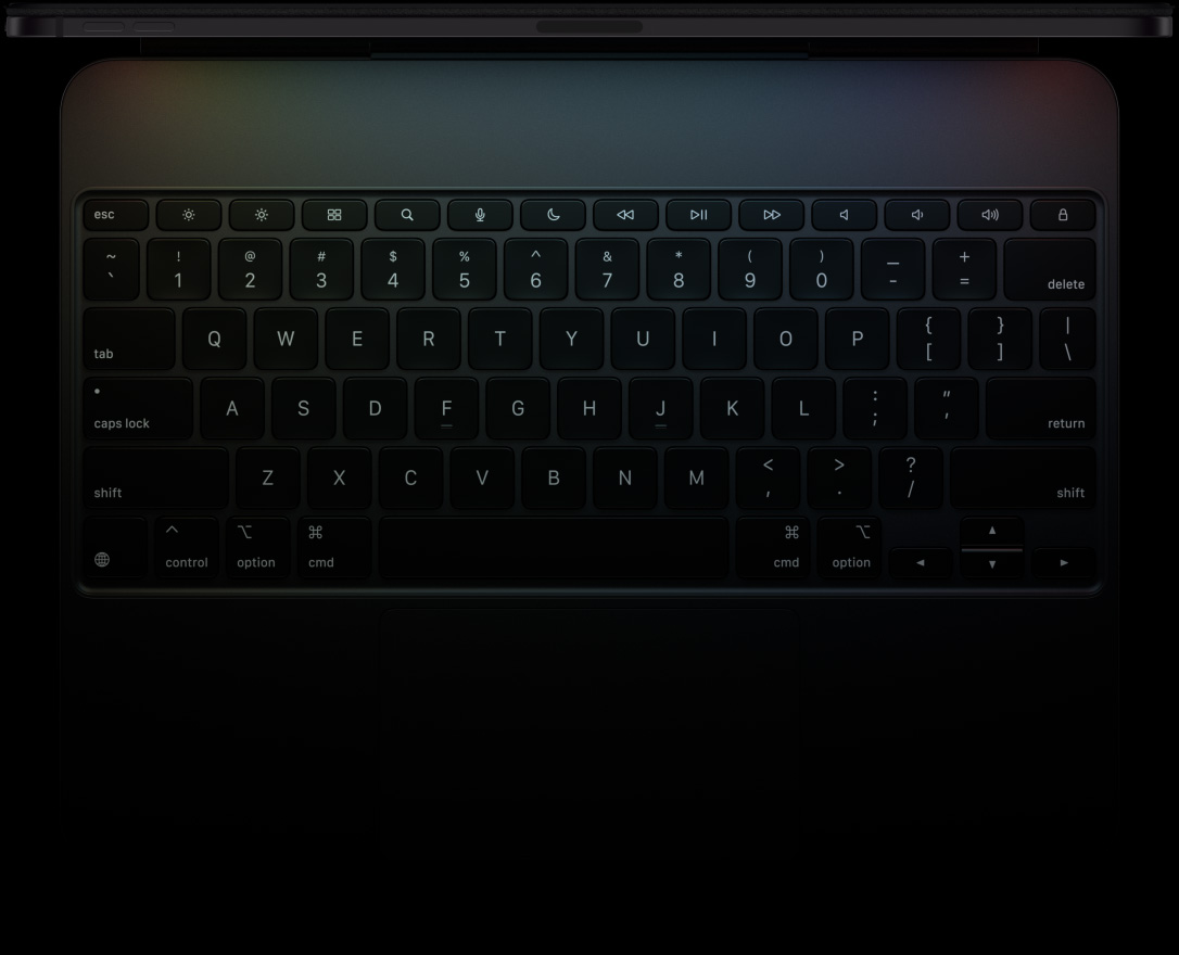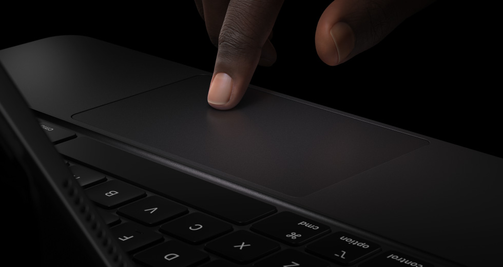 Magic Keyboard delivers an amazing typing and trackpad experience in a sleek, portable design with an aluminum palm rest.12 The keyboard includes a function row and a large glass trackpad with haptic feedback for precise work and Multi‑Touch gestures.
