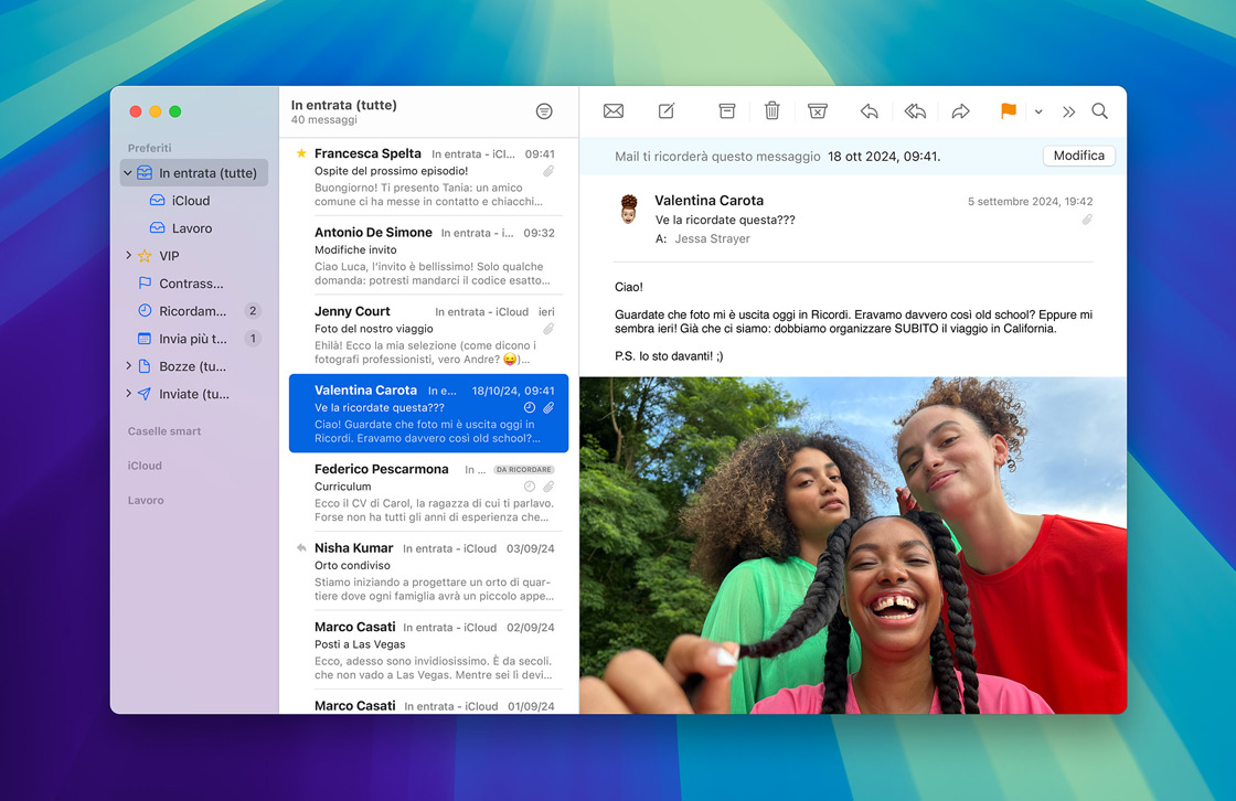 iCloud Mail si integra alla perfezione con l’app Mail sul tuo iPhone, iPad o Mac e ti permette di usare iCloud.com per inviare e ricevere email ovunque ti trovi. Ha di serie potenti funzioni per la sicurezza, come un sistema contro spam e phishing che rileva i messaggi indesiderati e li blocca prima che arrivino nella tua casella. Configurare il tuo indirizzo @icloud.com è facile, e abbonandoti ad iCloud+ potrai anche usare un dominio email personalizzato.