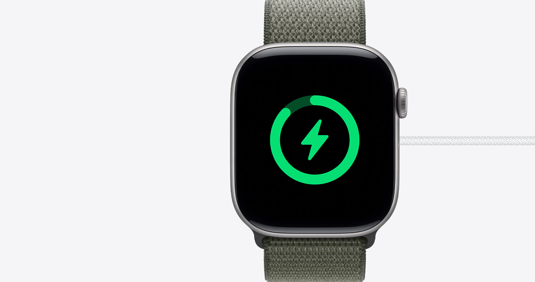 Apple Watch Series 11, silver color, aluminum case, Activity rings: Move, Exercise, Stand, right side exterior, Digital Crown dial, side button, microphone, band, neon yellow Sport Loop