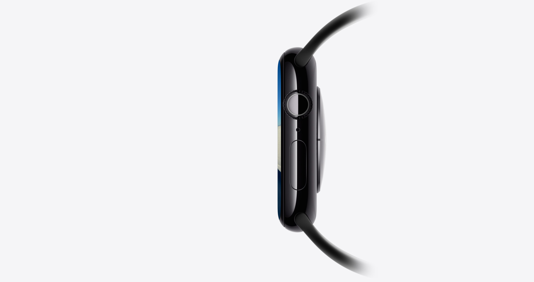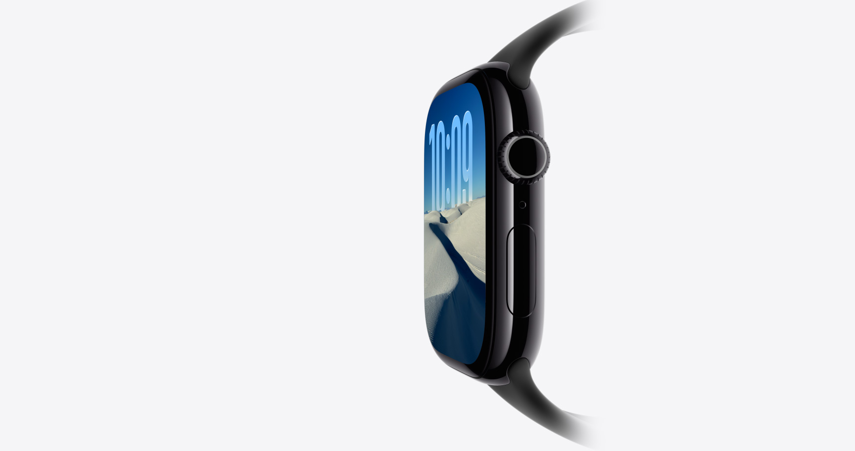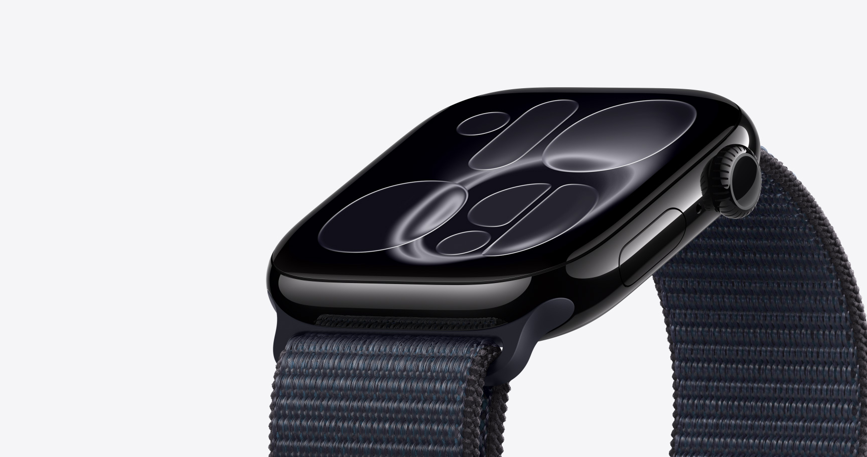 Apple Watch SE 3, aluminum case, midnight color, Flux watch face, right side exterior, Digital Crown, microphone, side button, midnight Sport Band, midnight pin-and-tuck closure