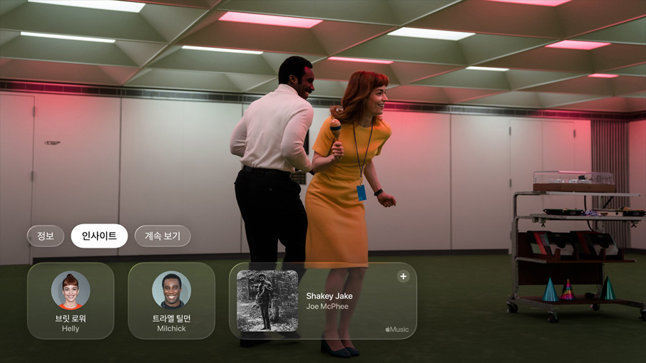 인사이트. Apple Original 시리즈 및 영화를 시청하면서, 동시에 관련 정보를 확인할 수 있습니다. 미디어 플레이어 제어기를 불러오기만 하면 화면에 등장하는 배우와 지금 흘러나오는 음악에 대해 더 자세히 알 수 있죠. 장면이 바뀌면 관련 정보도 자동으로 업데이트됩니다. 또한, iPhone을 Apple TV 리모컨으로 사용 중인 경우엔 ‘인사이트’ 정보가 iPhone에 뜨기 때문에 손안에서 바로 확인할 수 있답니다.5