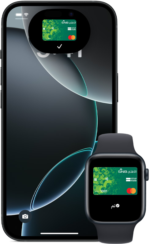 قم بإعدادها على iPhone، بثوان معدودة. تأتي Apple Pay مدمجة في iPhone وApple Watch وMac وiPad. افتح تطبيق المحفظة في iPhone وانقر على علامة زائد للبدء. ثم أضف بطاقة ائتمان أو سحب بالنقر على الجزء الخلفي من جهازك iPhone مستخدماً بطاقتك المؤهلة.1 سيكون لديك خيار إضافة بطاقتك إلى أجهزتك الأخرى في الوقت نفسه. ولتسديد ثمن مشترياتك، اضغط مرتين ثم مرر للدفع وانطلق. وسيظل بإمكانك الحصول على المكافآت والمزايا التي تقدمها بطاقتك، ولن تخسر النقاط أو الأميال.