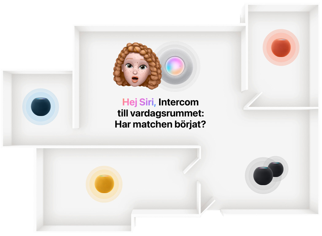 Det är hur enkelt som helst att få suveränt ljud i hela huset – och du har full kontroll över varje enskild HomePod mini, oavsett var du är. Med HomePod mini och en Apple-enhet kan du också kommunicera snabbt och smidigt med rösten via Intercom.