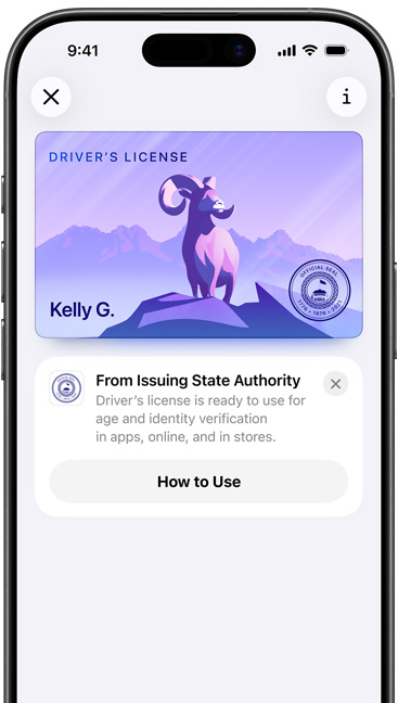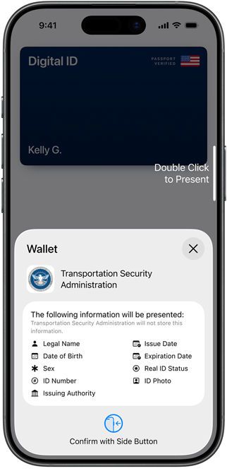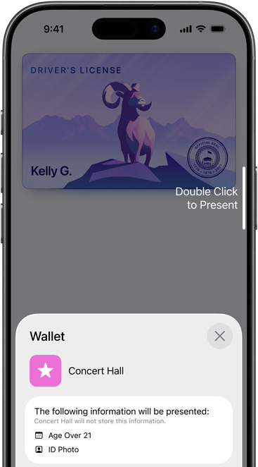 • To present your ID in Apple Wallet on an iPad or Mac, tap Verify Identity. On your nearby iPhone, you’ll be shown a consent sheet with the requesting website’s logo and name, the information being presented, and whether that data will be retained. To approve, double-click the button on the side of your iPhone and authenticate with Face ID or Touch ID.