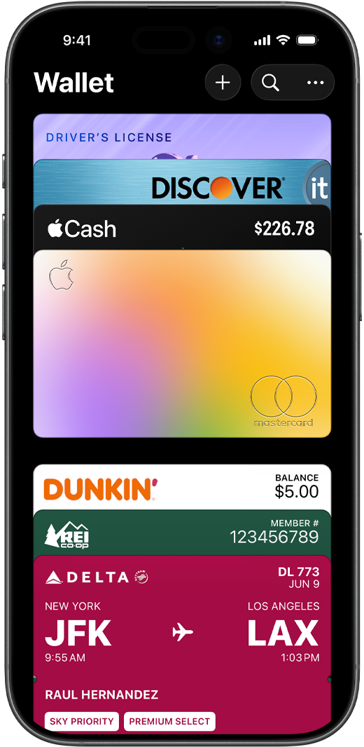 The Wallet app lives right on your iPhone. It’s where you securely keep your credit and debit cards, eligible driver’s license or state ID, transit cards, event tickets, keys, and more — all in one place. And it all works with iPhone or Apple Watch, so you can take less with you but always bring more.